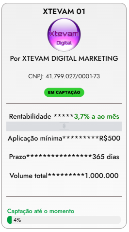 - 2º – Ao adquirir um dos pacotes de Tokens Xtevam 01, a Dma Investimentos e irá depositar por meio de Pix mensalmente durante um período de dois anos contando da data de compra e pagamento do pacote de Tokens Dma em uma conta cadastrada no momento da compra pelo comprador o valor fixo de 3% ao mês tendo como referência o valor do pacote de tokens Dma pago pelo comprador e será depositado na conta do investidor de seis e seis meses.